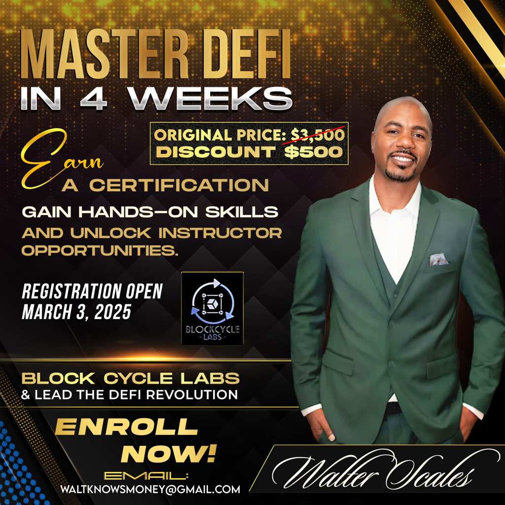 Learn directly from Walter Scales, Founder of Block Cycle Labs and DAO Manager, as he breaks down the DeFi landscape—from liquidity pools and yield farming to staking, tokenomics, and governance. Walter brings real-world experience managing DAOs and deploying strategies that generate both passive and active income in the Web3 space.